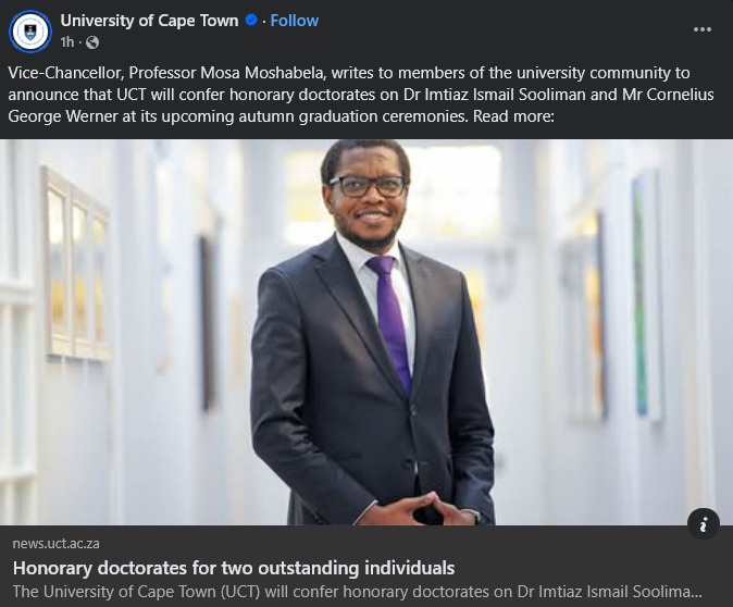 On 30 March, the University of Cape Town (UCT) is scheduled to confer an honorary doctorate on Dr Imtiaz Sooliman, founder of Gift of the Givers.
